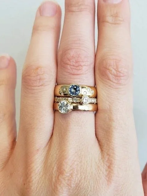 Many clients bring several pieces of jewellery at once — inherited rings, outdated settings, or loose stones that have accumulated over time. Together we explore creative ways to reuse what you have, sometimes combining stones or reworking elements into an entirely new design.