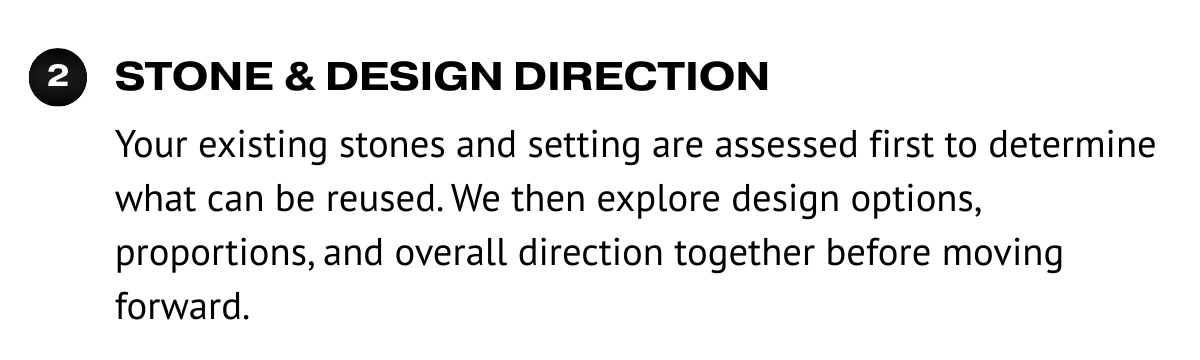 Each project begins with a careful assessment of your existing stones and possibilities before a new design is developed around them.